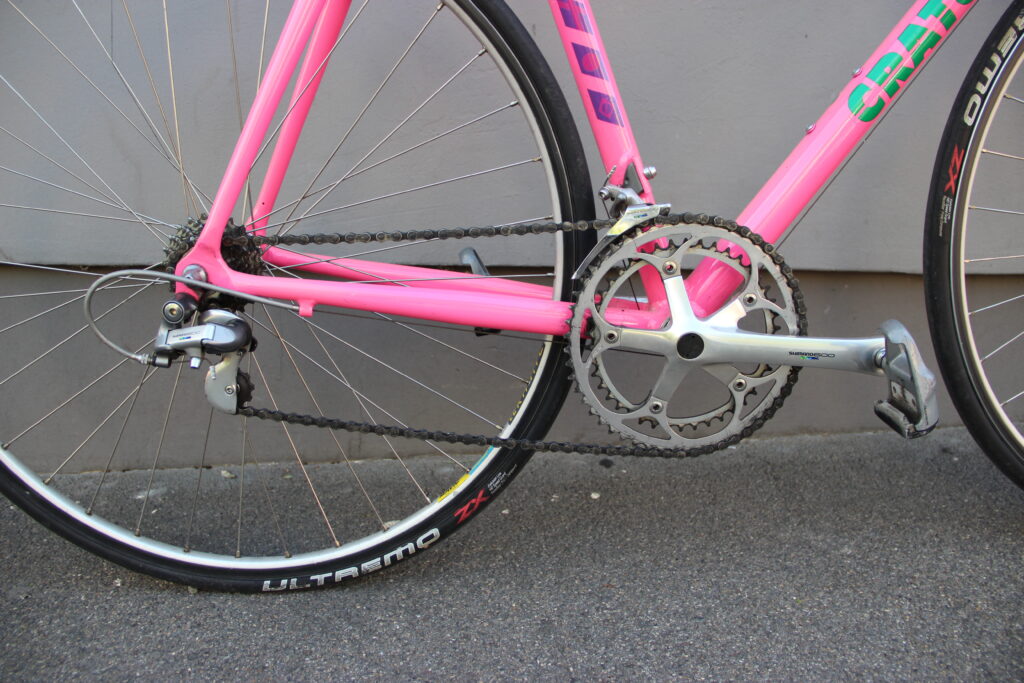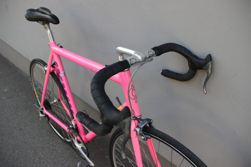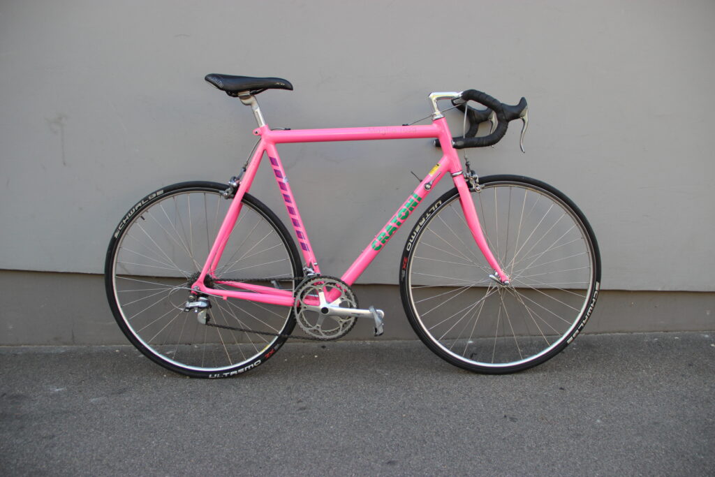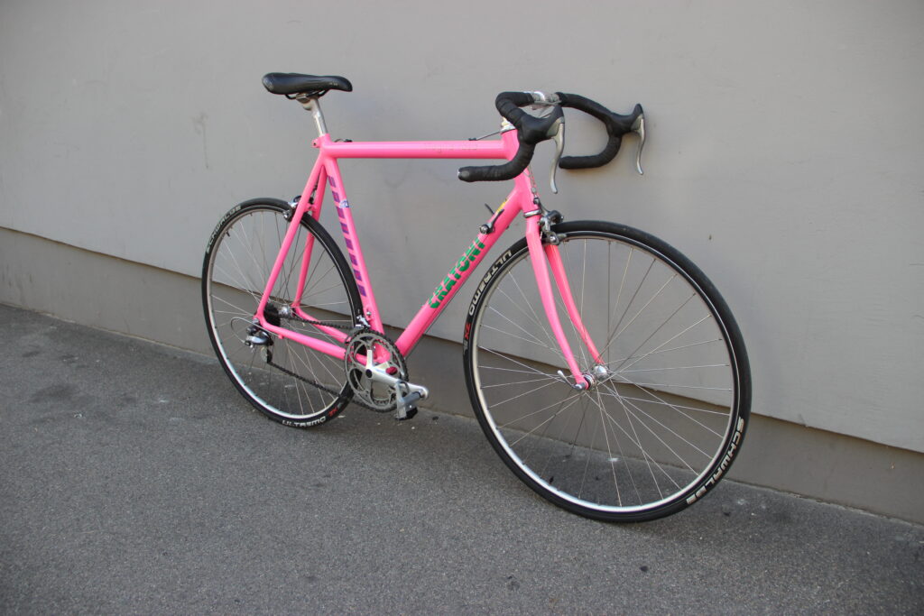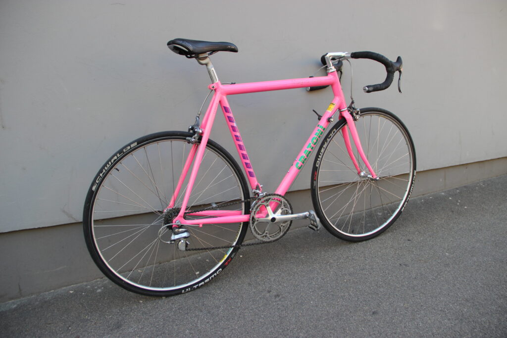 So, what's the color of the bicycle? - Ehmmmmmmmm it's like indianred, kind of ehmmm peach! Nono ehm coral, I mean a sort of pinkish, a bit you know? You love it or hate it. And of corse, I love it! The bicycle is something special, runs amazing and comes all with Shimano 600 components! Or with the words of my friend: 'Geili...nimmi! So nice!'